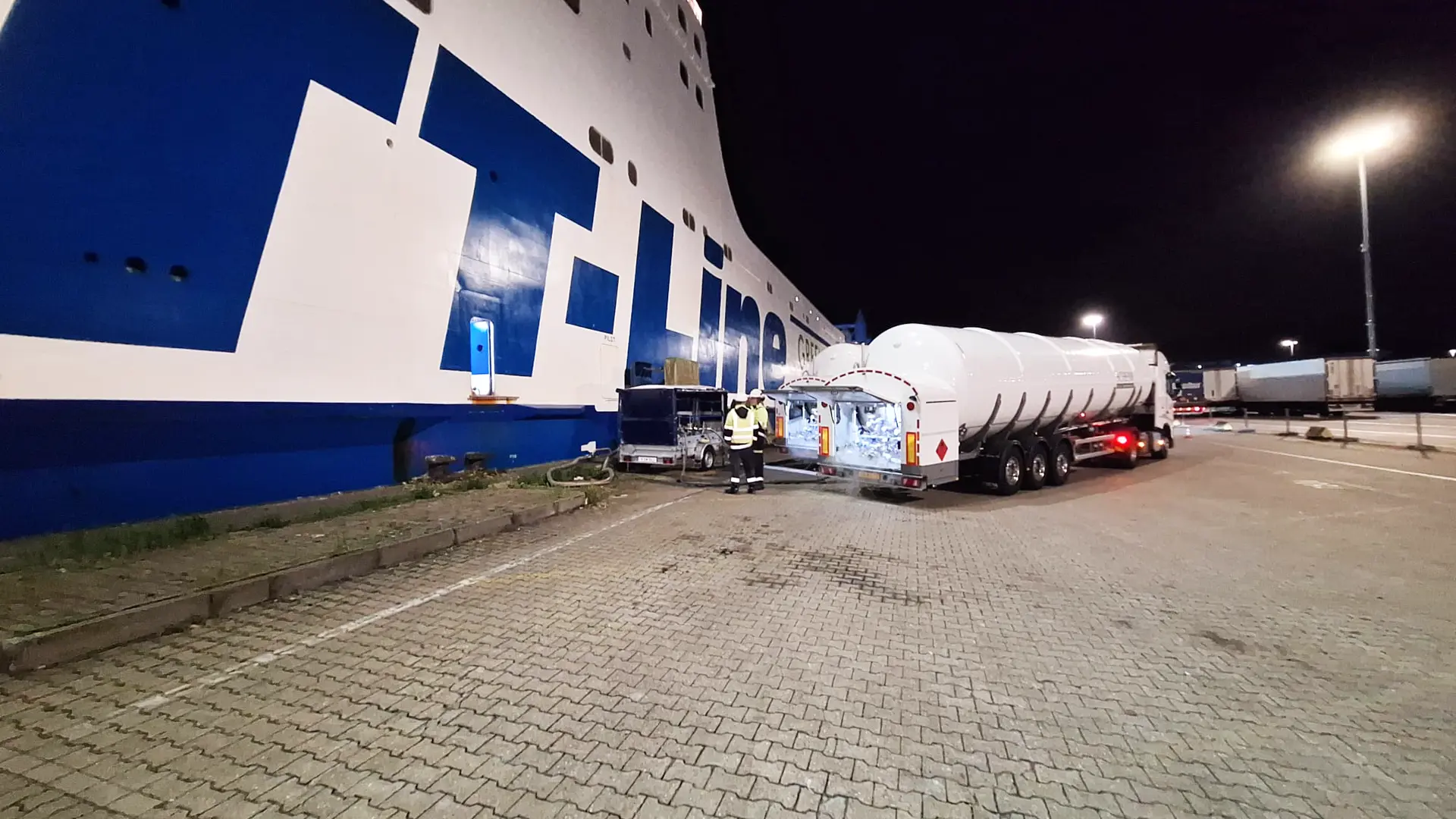 Foto: Probebetankung der TT-Line-Fähre Peter Pan mit Bio-LNG von EnviTec Biogas in Travemünde (Foto: Jan-Peter de Haan, Schenk Tanktransport GmbH)